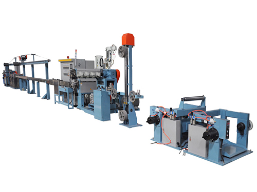 电源线电力电缆押出机主要用于电源线,绝缘设套、电力电缆等线材的押出,其主要由放线架、主张力组、电力电缆押出机主机、主控柜、冷却水槽、牵引机、火花机、收线机以及印字机、测径仪、PLC控制、双履带式牵引和各类规格无轴式收排线机。