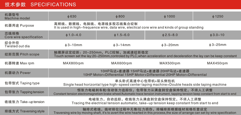 适用于控制电缆、通讯电缆、数据电缆、同轴电缆等PE或PVC被覆芯线绞合及中心包带或侧